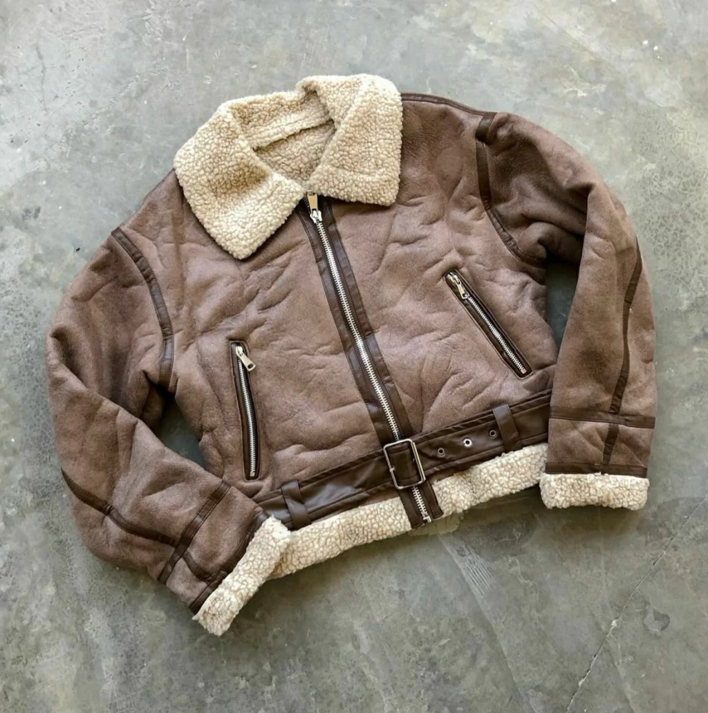 Campera gamulán (importada) de tela gamuza con forrería en corderito a contratono. Tiene cinturón, cierres y terminales metálicas.