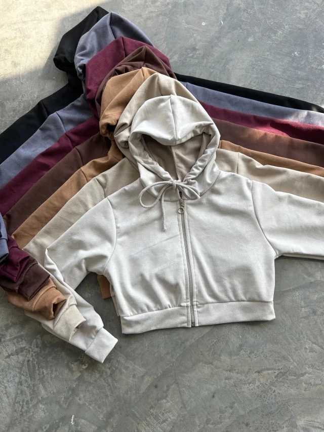CAMPERA GAMUZADA CROP CON CAPUCHA Y BOLSILLOS