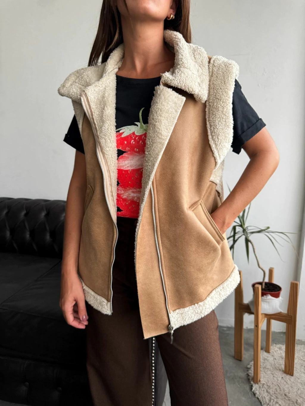 Chaleco estilo gamulán de gamuza con forrería de corderito sintético. Tiene bolsillos a ambos lados y es súper abrigado!