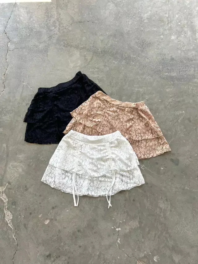 Delicada y con estilo, esta mini falda de encaje es ideal para crear looks románticos o de noche. Su diseño de doble capa con volados y frunce ajustable al frente aporta movimiento y un toque distintivo.