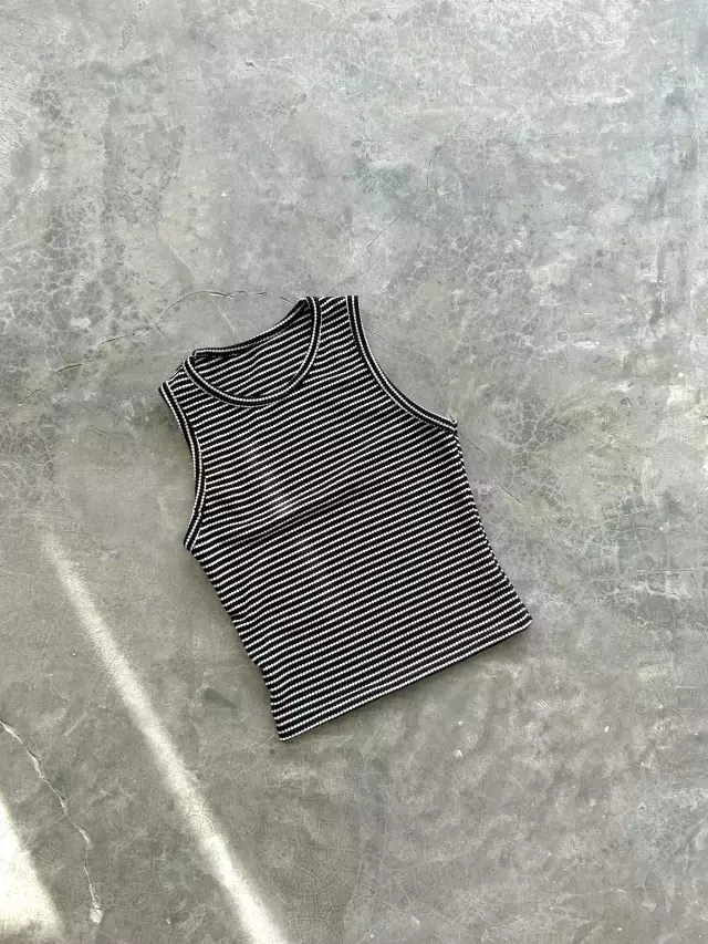 Un básico infaltable para todos los días. Este top musculosa de corte ajustado está confeccionado en un tejido suave y elástico que se adapta perfectamente al cuerpo. Su diseño clásico de rayas finas en blanco y negro lo convierte en una prenda versátil, ideal para combinar con jeans, shorts o faldas y lograr un look casual y moderno.