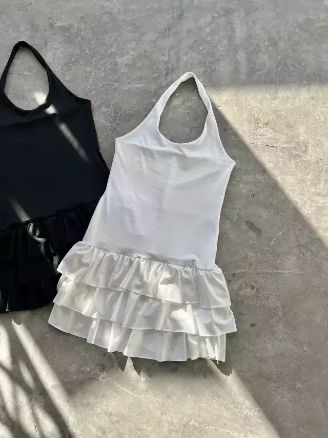 Elegante y versátil, este vestido corto es ideal para cualquier ocasión especial o salida casual. Con un diseño de cuello halter y espalda descubierta, resalta la silueta con un toque moderno y femenino. Su falda con volados en capas le aporta movimiento y frescura, convirtiéndolo en una prenda única y con mucho estilo.